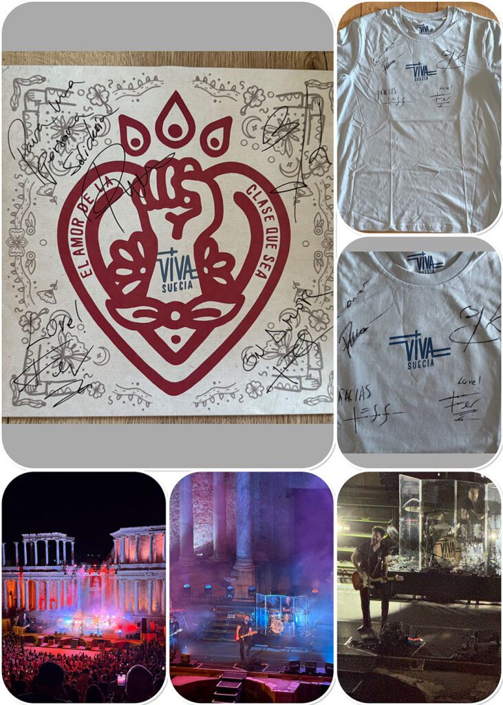Vinilo y camiseta de CorazonEx Solidario firmados por Viva Suecia el 13 de junio de 2025 en Mérida (Badajoz), durante su participación en el Stone Music Festival.