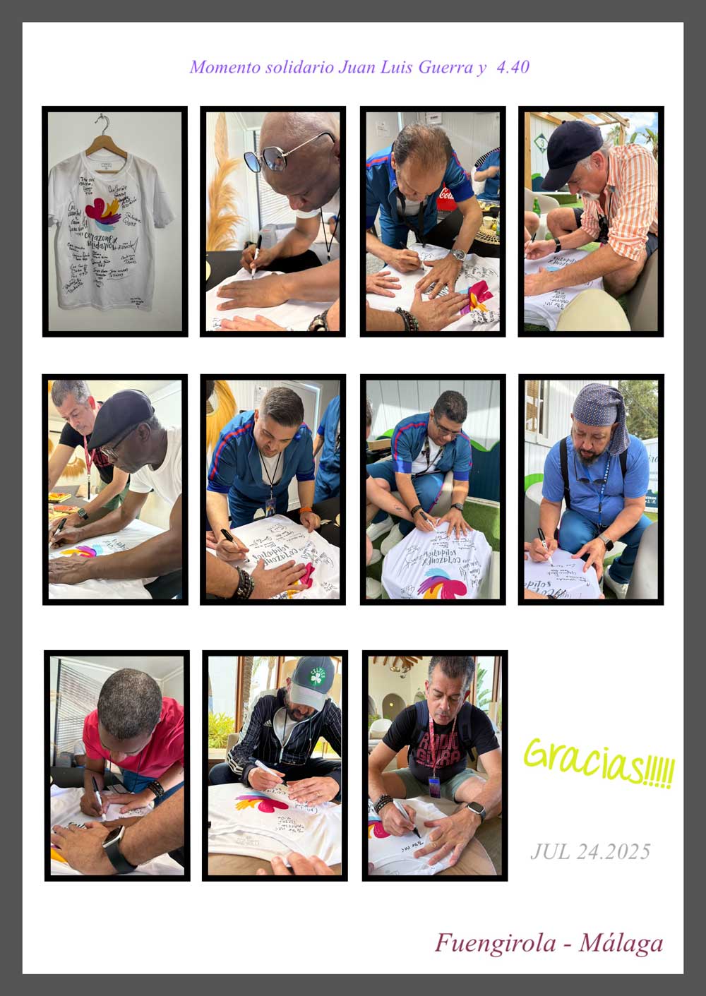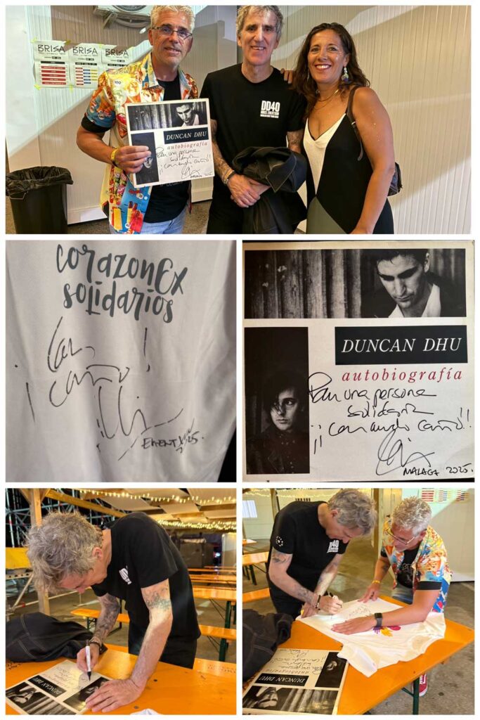 Vinilo y camiseta de CorazonEx Solidario firmados por Juan Luis Guerra y toda la banda de 4.40 el 24 de julio de 2025, durante su participación en el festival Marenostrum de Fuengirola (Málaga).