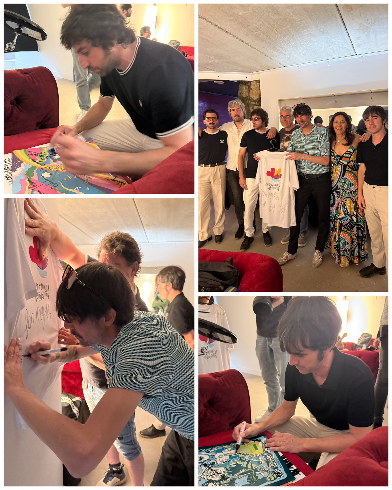 Vinilo y camiseta de CorazonEx Solidarios firmados por Juan Luis Guerra y toda la banda de 4.40 el 24 de julio de 2025, durante su participación en el festival Marenostrum de Fuengirola (Málaga).